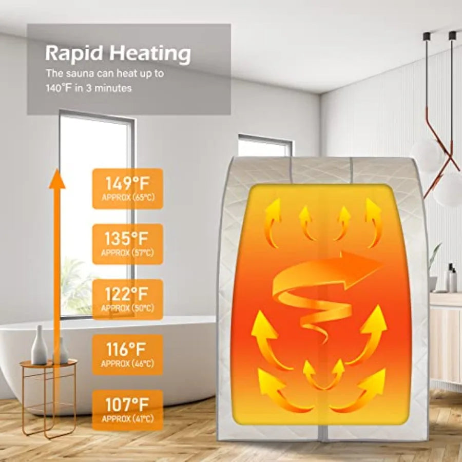 One‑person infrared sauna with remote‑controlled heat, foot pad, and foldable chair