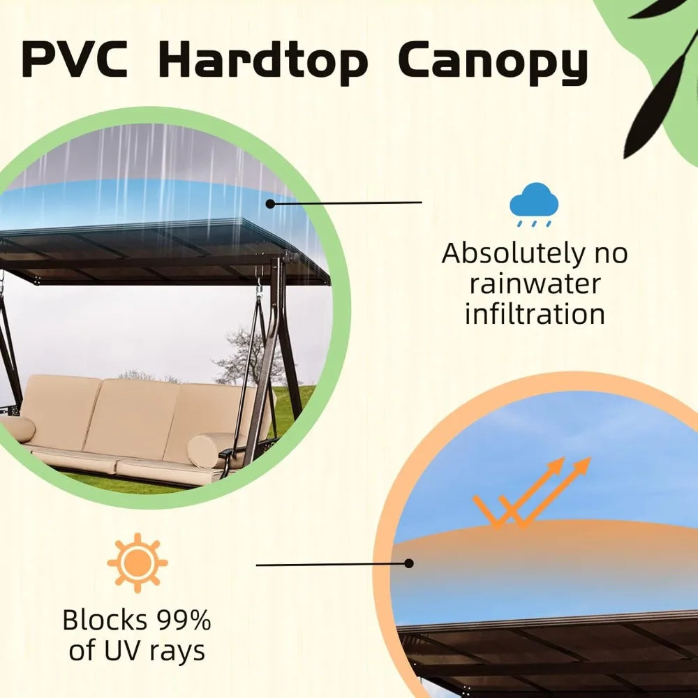 Oversized Convertible 3-Seater Porch Swing with Hardtop, 2 Side Cup Holder